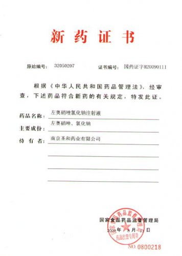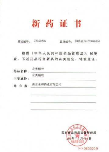 2009年8月15日,我公司具有5項國家發(fā)明專利、2項歐美專利的創(chuàng)新藥左奧硝唑原料及氯化鈉注射液制劑獲國家食品藥品監(jiān)督管理局國家一類新藥證書及生產(chǎn)批件。