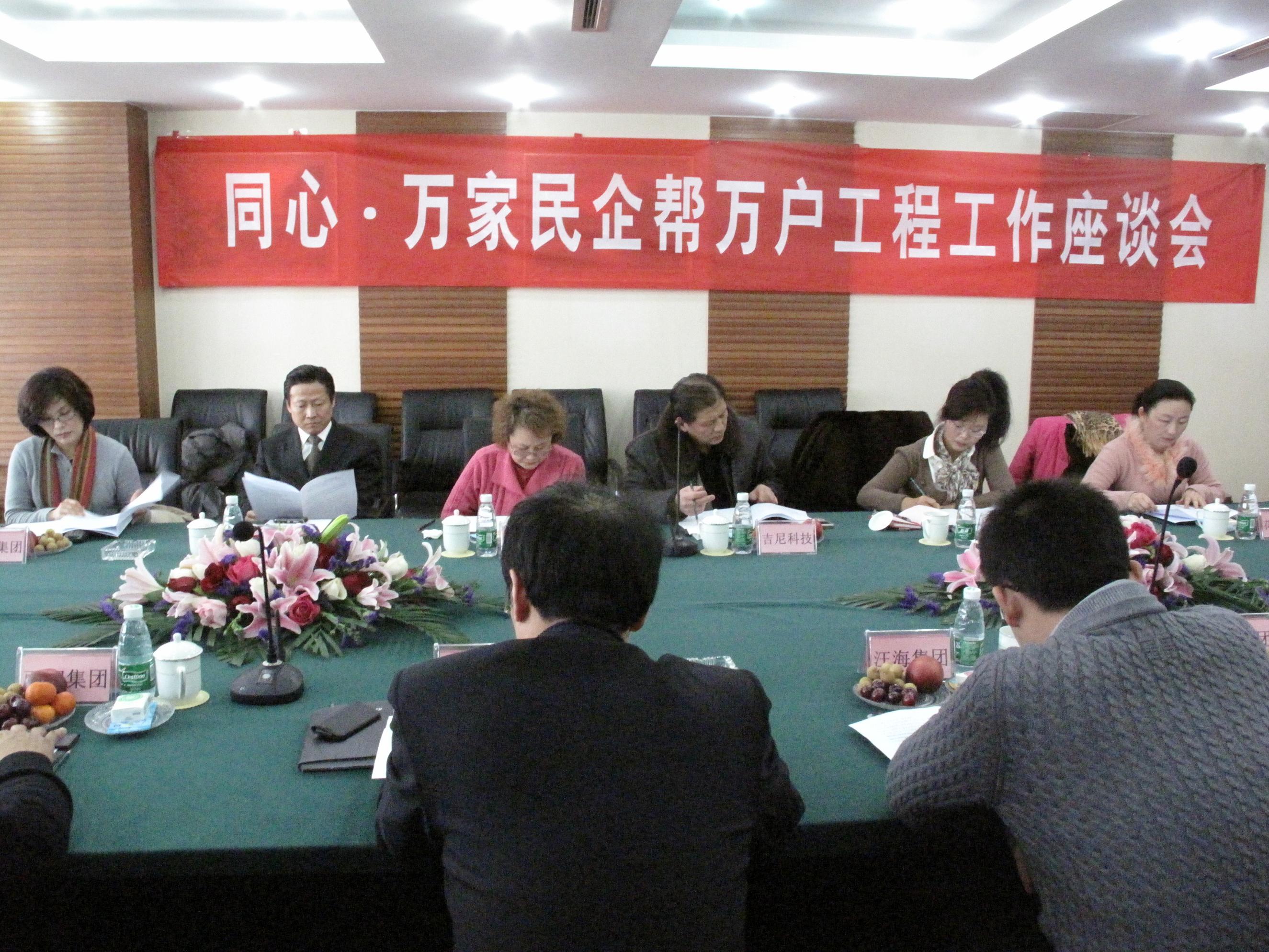 本網(wǎng)訊 為充分發(fā)揮非公有制企業(yè)在南京市幸福都市建設(shè)和率先基本實(shí)現(xiàn)現(xiàn)代化中的積極作用,全市統(tǒng)一戰(zhàn)線將組織萬家非公有制企業(yè)幫扶萬戶特困家庭,開展“同心·萬家民企幫萬戶工程”活動(dòng)。2月7日,南京市委統(tǒng)戰(zhàn)部“同心·萬家民企幫萬戶工程”工作座談會(huì)在圣和集團(tuán)總部召開。南京市工商聯(lián)副主席李冰、南京市委統(tǒng)戰(zhàn)部經(jīng)濟(jì)處處長(zhǎng)鄭德巍、南京市工商業(yè)聯(lián)合會(huì)經(jīng)濟(jì)處處長(zhǎng)錢衛(wèi)冰,以及雨潤(rùn)集團(tuán)、圣和集團(tuán)、商貿(mào)集團(tuán)、汪海集團(tuán)、晨林商貿(mào)、飛元集團(tuán)、易記小吃店、吉尼科技、新葉時(shí)裝、花旗涂料等企業(yè)負(fù)責(zé)人參加會(huì)議。