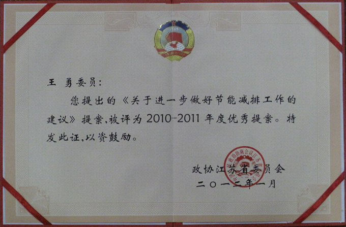 為鼓勵先進,不斷增強政協(xié)履行職能的實效,日前,經(jīng)省政協(xié)十四屆四十六次主席會議審議,政協(xié)江蘇省委員會表彰出72件優(yōu)秀提案和25篇優(yōu)秀視察調(diào)研報告。王勇董事長作為省政協(xié)委員,提出的《關于進一步做好節(jié)能減排工作的建議》提案,被表彰為2010-2011年度優(yōu)秀提案。