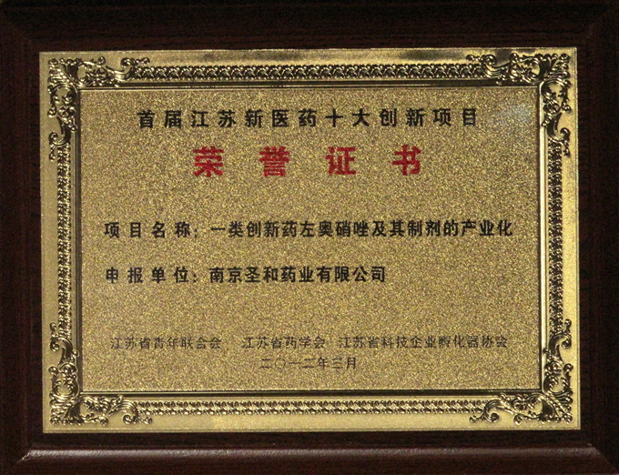 為了深入實(shí)施科教興省和人才強(qiáng)省戰(zhàn)略,促進(jìn)新醫(yī)藥等六大新興產(chǎn)業(yè)的發(fā)展,發(fā)現(xiàn)和凝聚一批青年創(chuàng)新創(chuàng)業(yè)領(lǐng)軍人才,江蘇省青年聯(lián)合會(huì)、江蘇省藥學(xué)會(huì)、江蘇省科技企業(yè)孵化器協(xié)會(huì)聯(lián)合在全省范圍內(nèi)開展了首屆江蘇新醫(yī)藥科技創(chuàng)新創(chuàng)業(yè)項(xiàng)目大賽暨青年科技領(lǐng)軍人才舉薦活動(dòng)。目前,我司申報(bào)的“一類創(chuàng)新藥左奧硝唑及其制劑的產(chǎn)業(yè)化”項(xiàng)目,被授予“首屆江蘇新醫(yī)藥十大創(chuàng)新項(xiàng)目”榮譽(yù)稱號(hào)。